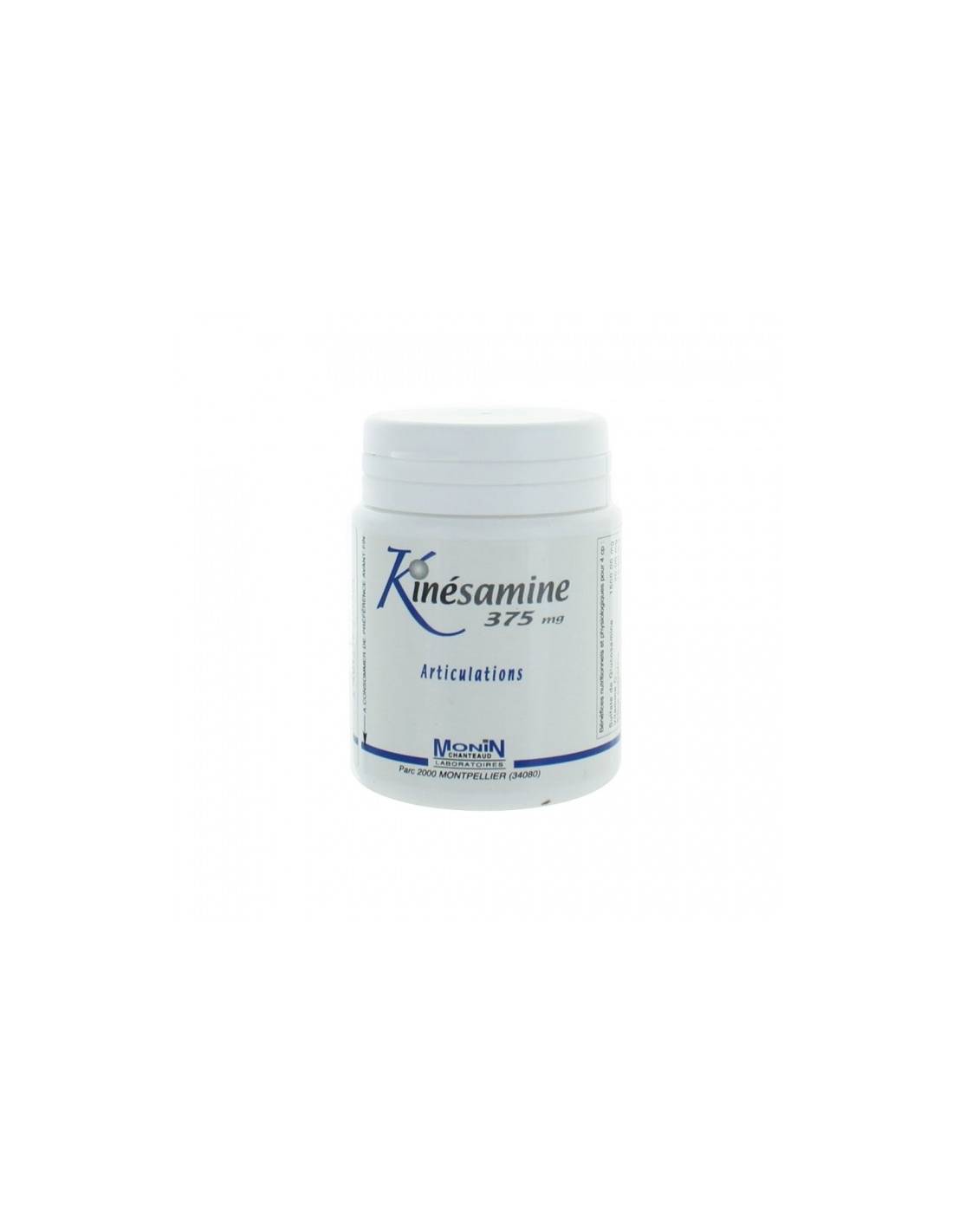 Kinésamine 375 mg Articulations Complément alimentaire 120 comprimés Complément alimentaire à base de glucosamine, soufre, manganèse, zinc et silicium. Contient de la vitamine C qui contribue à la formation normale du collagène pour assurer la fonction normale du cartilage. Monin Chanteaud Parc 2000 34080 Montpellier France
