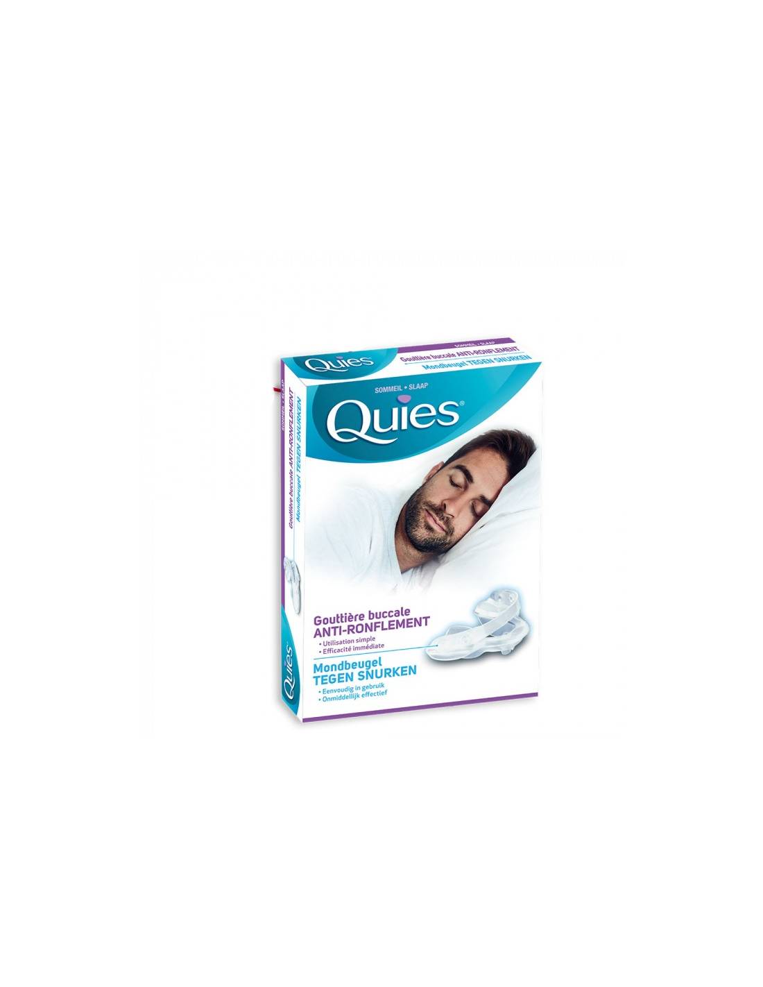 QUIES Gouttière buccale anti-ronflement Utilisation simple Efficacité immédiate Réglage personnalisable pour une efficacité immédiate Dispositif médical Lors de l’endormissement, les muscles et les tissus mous du palais et de la luette se relâchent et provoquent un rétrécissement des voies respiratoires. Survenant durant le sommeil, le ronflement est un bruit se produisant durant l’inspiration. Il est la conséquence d’une vibration causée par le passage de l’air à travers les tissus qui se sont relâchés. Quelle solution pour améliorer le passage de l’air et ainsi contribuer à l’arrêt du ronflement? La gouttière buccale est un dispositif médical destiné à réduire le ronflement et à procurer un sommeil réparateur grâce à son action mécanique sur la gorge, en dégageant le pharynx et favorisant le passage de l’air. En maintenant la mâchoire inférieure en position légèrement avancée (quelques millimètres), les voies respiratoires vont s’ouvrir, permettant ainsi le passage de l’air inspiré. La gouttière buccale est adaptable grâce aux différentes bandes souples fournies. En cas d’utilisation régulière continue (toutes les nuits) et pour une durée prolongée, nous recommandons l’utilisation d’une orthèse d’avancée mandibulaire Quies. La gouttière buccale anti-ronflement Quies, permet une utilisation simple chez les personnes sujettes aux ronflements. La gouttière buccale anti-ronflement Quies avance la mâchoire inférieure de quelques millimètres et permet de dégager le pharynx et libérer le passage de l’air inspiré. Cette action permet de réduire le ronflement et de procurer un sommeil réparateur. Quatre bandes souples de tailles différentes sont proposées, pour un réglage de la gouttière buccale adapté au besoin de chacun. Dispositif médical, lire attentivement la notice.