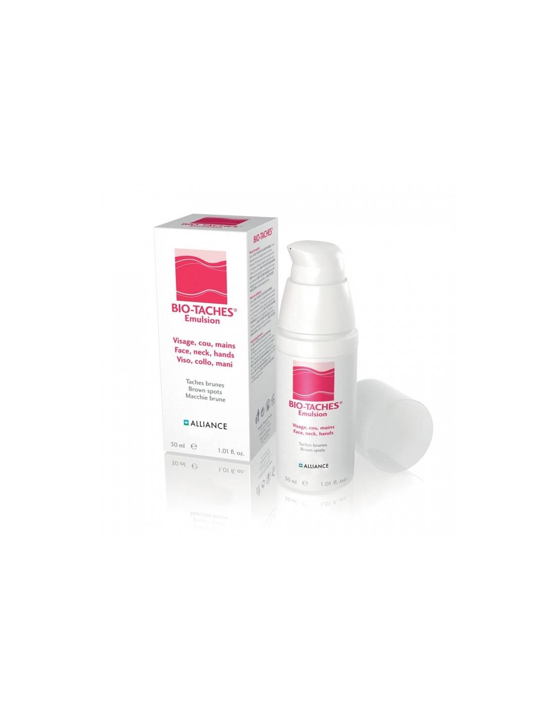 ALLIANCE PHARMA Bio-taches Emulsion Visage, cou, mains. Taches brunes. 30ml Bio-Taches® Emulsion est un soin apportant une solution pour la prise en charge des tâches brunes et de l'hyperpigmentation cutanée, notamment dans les cas suivants : Mélasma (masque de grossesse), dyschromie (taches de vieillesse), lentigo solaire, marques cicatricielles post-inflammatoires (acné,…). Grâce à sa formulation unique, Bio-Taches® Emulsion agit sur : - la dépigmentation des taches brunes - le renouvellement cellulaire - la diminution de production de mélanine Bio-Taches® Emulsion est un soin novateur et réellement efficace pour lutter contre les tâches brunes sur la surface de la peau.