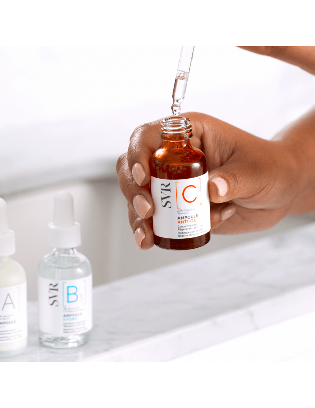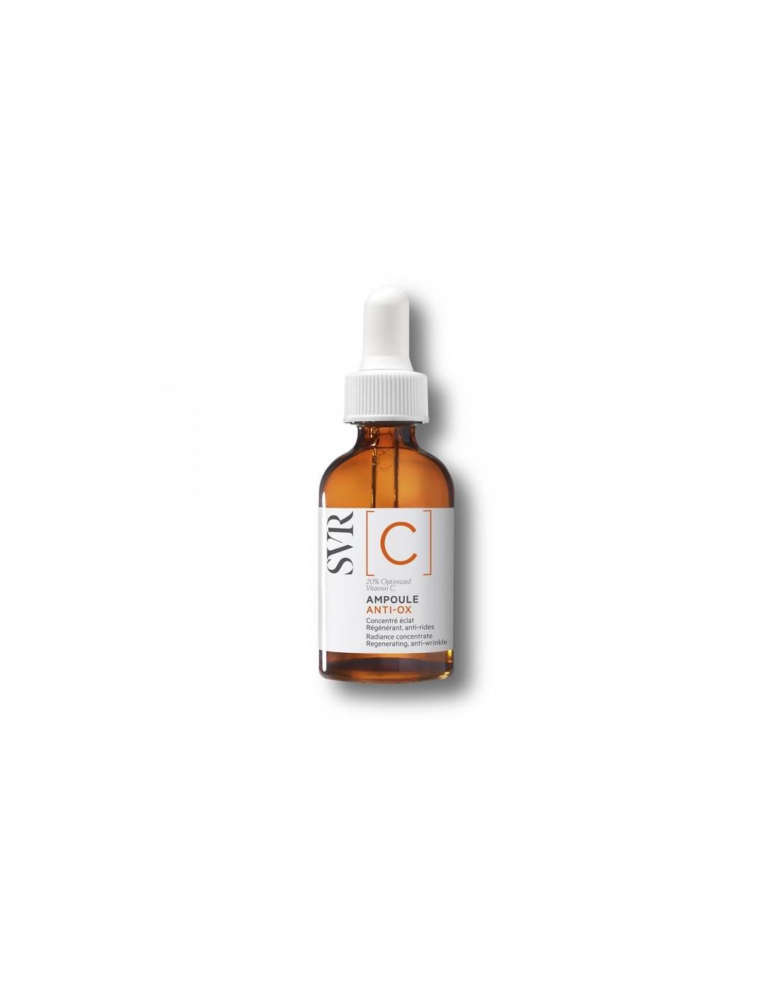 SVR Ampoule Anti-Ox Vitamine C 20% Tous types de peaux 30ml. L'ampoule Anti-Ox Vitamine C 20% convient à tous les types de peaux. Elle permet de recharger la peau et de réguler la synthèse de mélanine. L'ampoule vient révéler l'éclat du teint. Elle est formulée avec des actifs puissants comme la vitamine C pour neutraliser les radicaux libres comme les UV, le stress et la pollution, tout en prévenant l'inflammation liée à la photoprotection. L'ampoule va tonifier la peau et estomper les signes de l'âge. Cette ampoule convient aussi aux teints ternes, aux peaux fatiguées avec un manque d'éclat et d'uniformité.