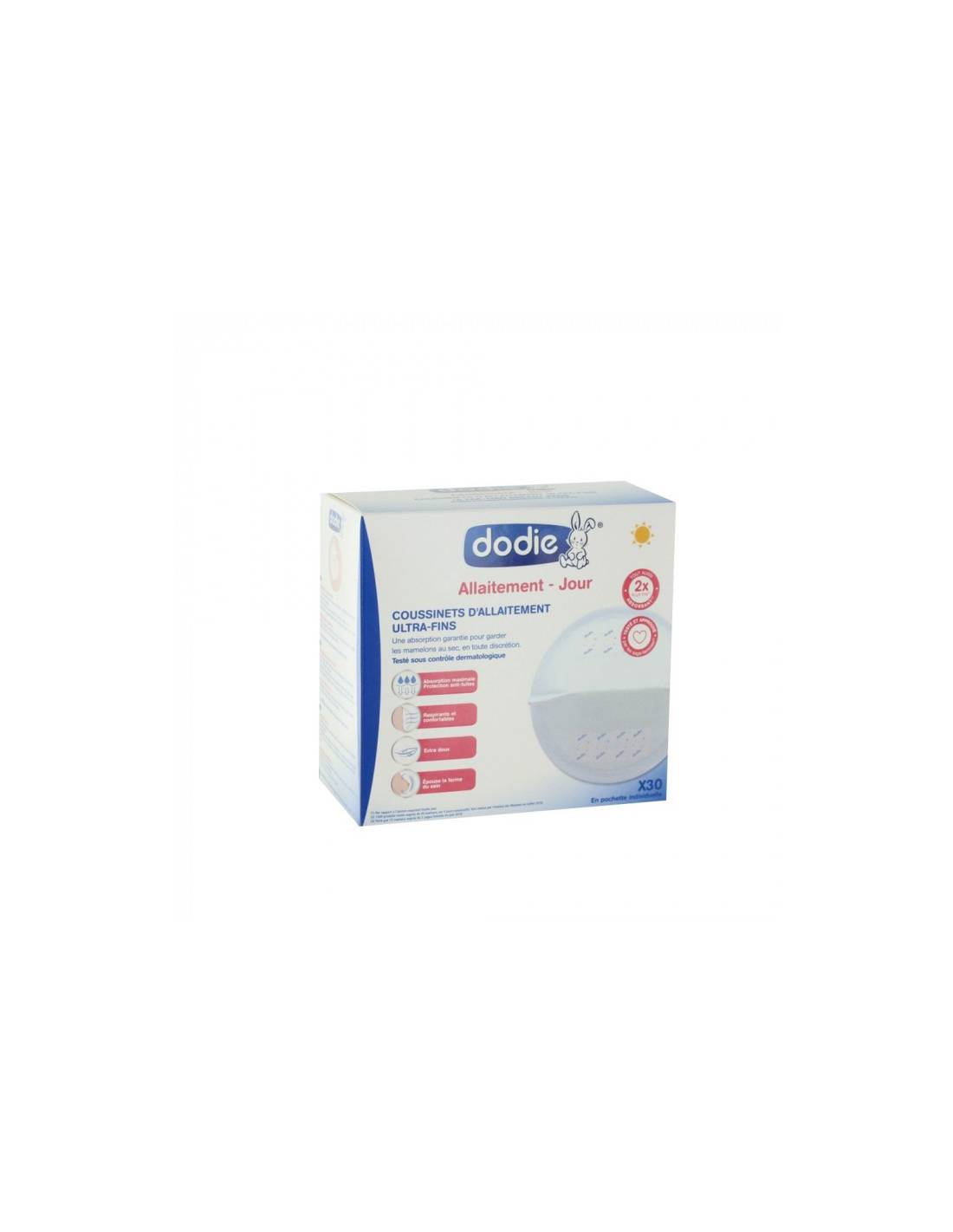 DODIE Coussinets d'allaitement Jour Pour absorber les pertes de lait et garder les mamelons au sec Double adhésif de maintien x 30 coussinets en pochette individuelle Les coussinets d'allaitement ULTRA-FINS Dodie ont été spécialement conçus pour absorber efficacement et en toute discrétion les pertes de lait tout en gardant les mamelons au sec. Des micro-perles ultra absorbantes captent le lait et le gardent à l'intérieur du coussinet.Développés pour minimiser le contact du lait avec la peau, les coussinets ULTRA-FINS. Dodie aident à limiter les risques de macération.   Une absorption garantie pour garder les mamelons au sec, en toute discrétion. Testé sous contrôle dermatologique Caractéristiques des Coussinets d'allaitement jour x30: - Absorption maximale. Protection anti-fuite - Respirants et confortables - Extra-doux - Epouse la forme du sein